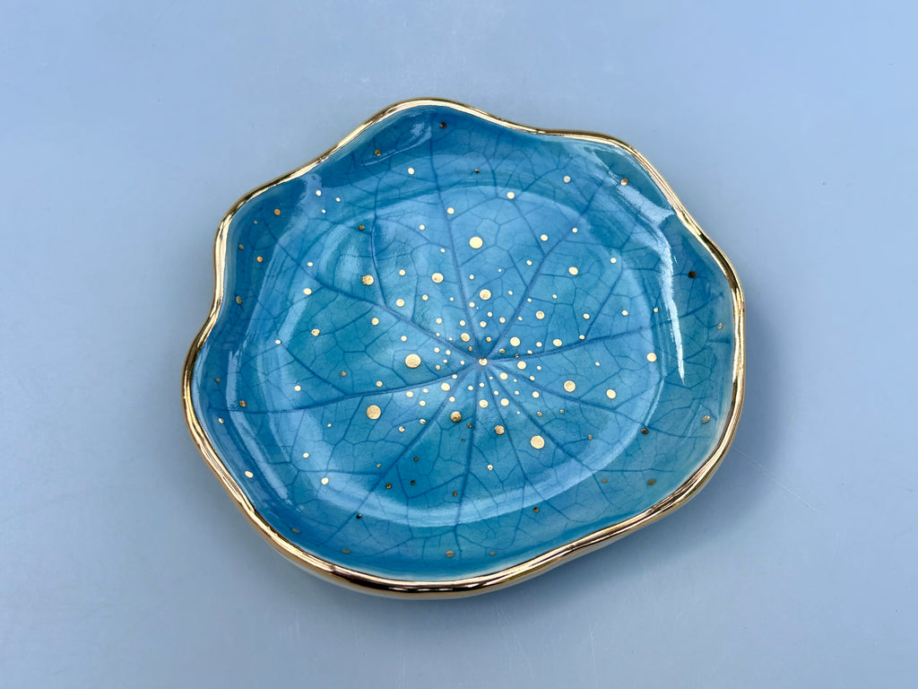 This blue leaf jewelry dish or trinket tray is handcrafted, glazed and fired in my studio. This beautiful organic leaf shape and intricate details are created from a real leaf from my garden, from a plant called Nasturtium