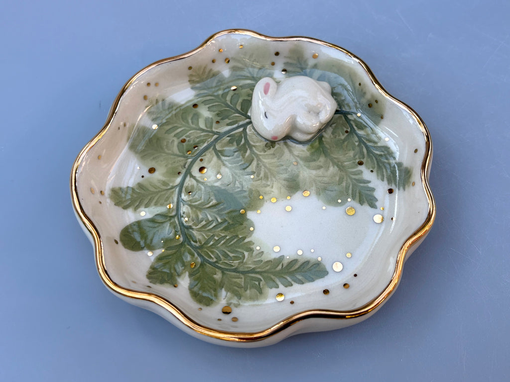 Bunny on Sparkling Fern Jewelry Holder, Ceramic Dish with Gold Accents