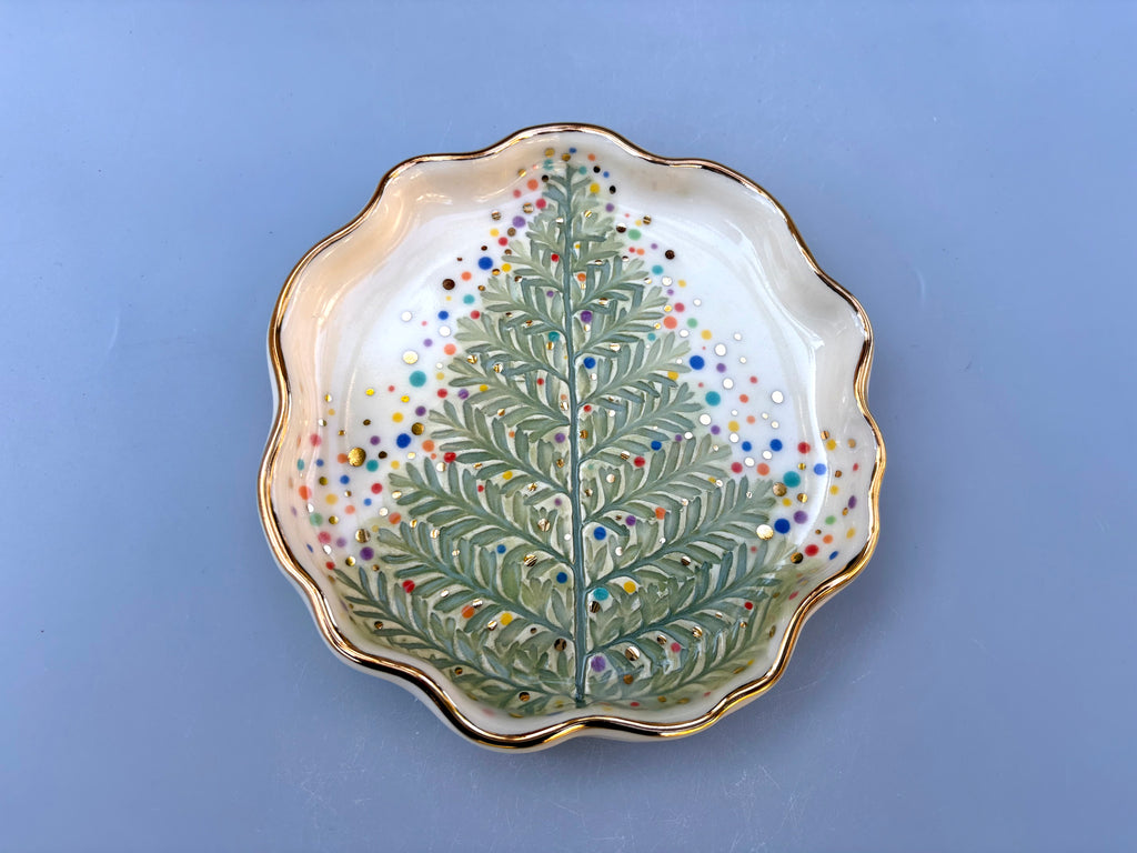 Here is a dish that captures a bit of the color and sparkle of a decorated tree - this "tree" is actually imprinted from a real fern frond which I thought worked perfectly as a miniature Christmas tree. The ceramic piece is handpainted and kiln-fired to over 2200F. The gold sparkles are real 22kt gold.