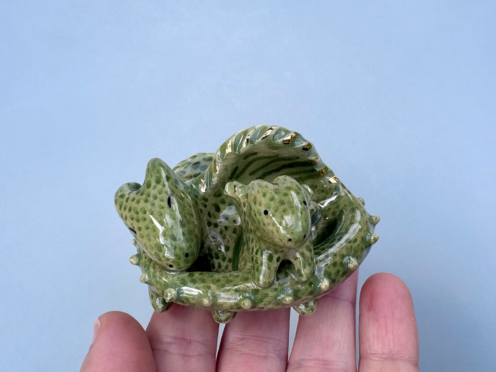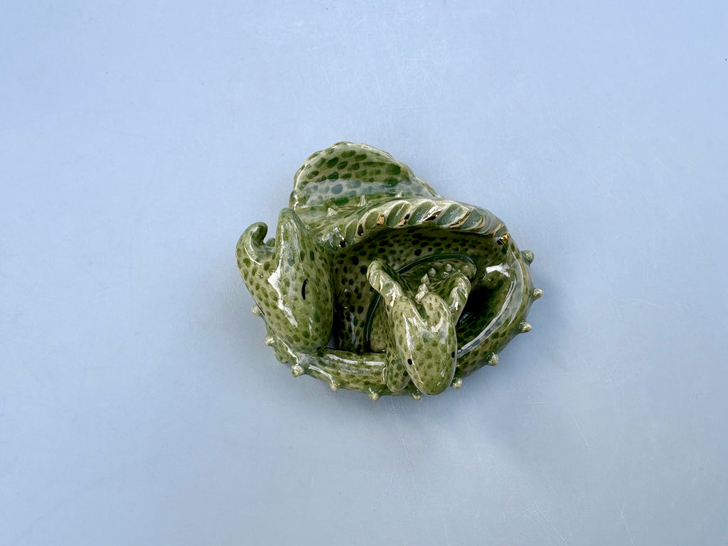 Small green dragon figurine, guarding its most precious treasure, hand sculpted and hand painted. Dragons symbolize protection, wisdom, and strength. Green dragons in particular are powerful guardians of nature, reminding us of our connection to the natural world around us and our harmony within that. This little dragon sculpture is ceramic, hand painted, and kiln fired to a glossy finish. The dragon sparkles with touches of real 22 karat gold.