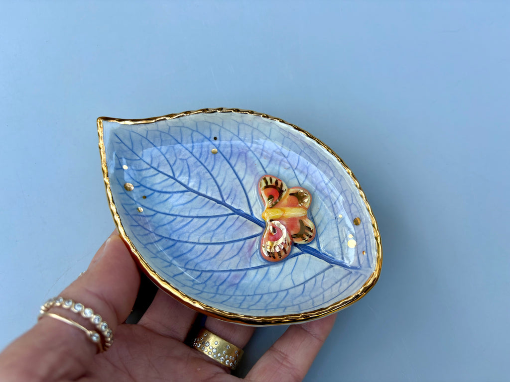 This butterfly ceramic dish is made from smooth porcelain-like stoneware clay, dried, bisque fired, glazed, and kiln-fired once more at approximately 2200 degrees Fahrenheit. The dish is made from a real hydrangea leaf. The butterfly is sculpted carefully by hand and then painted by hand with ceramic stains before the piece is fired in the kiln to full vitrification. The glaze is a glossy warm white with the beauty of a kiln-fired ceramic, showing off the intricate detail of the hand-painted leaf and the gorgeous wings of the butterfly . Real 22kt gold is applied and then fired a third time to bond the gold to the piece. It is a labor intensive process that is worth the extra step.