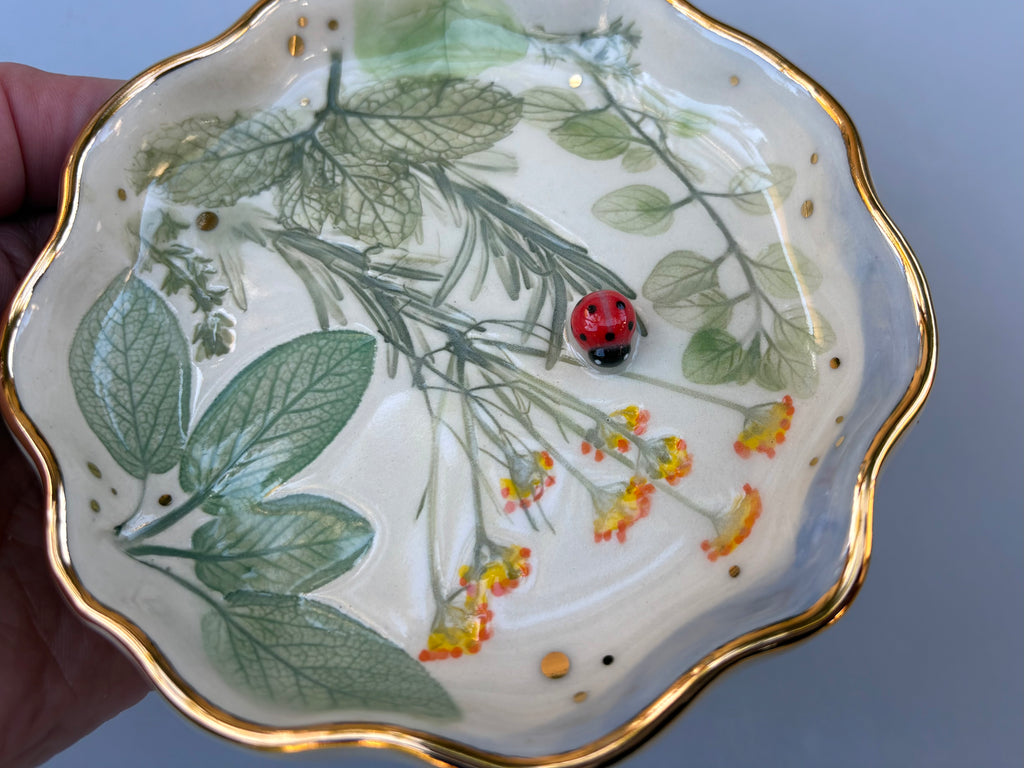 Ladybug with Herb Garden Jewelry Holder, Ceramic Dish with Gold Accents