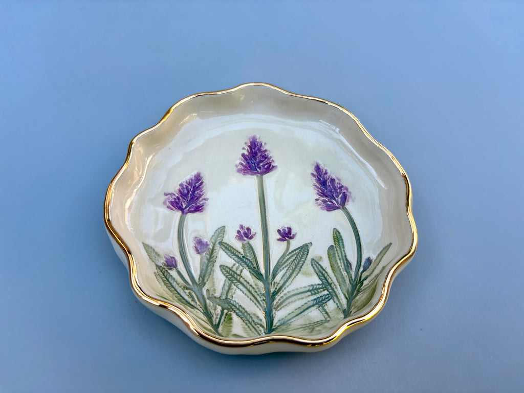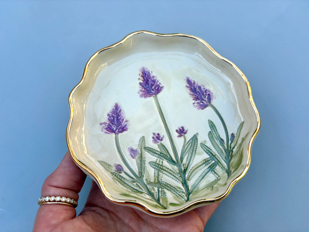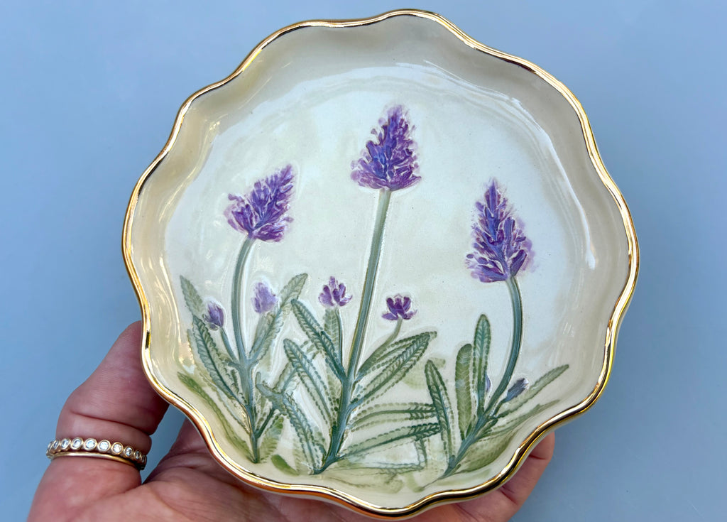 Slight variations and organic shapes in handcrafted ceramics are what make them perfectly unique pieces of art. Each dish is slightly different, capturing the unique beauty of each lavender flower.