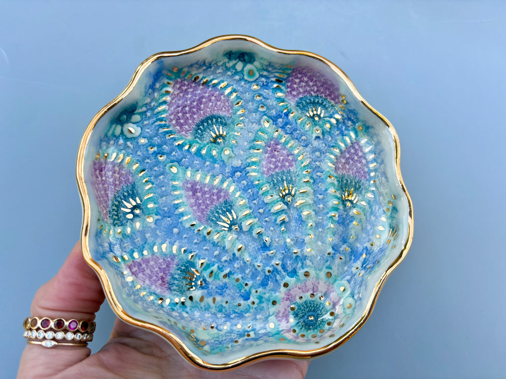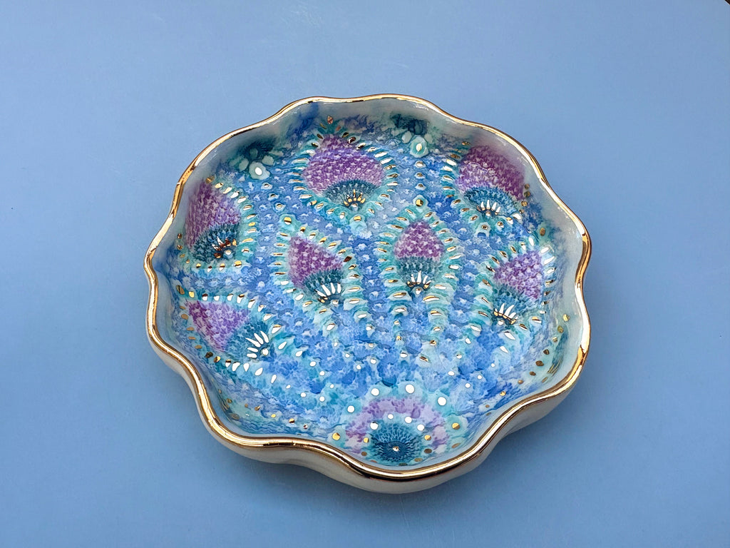 Sparkling Peacock Lace Jewelry Holder, Ceramic Dish with Gold Accents