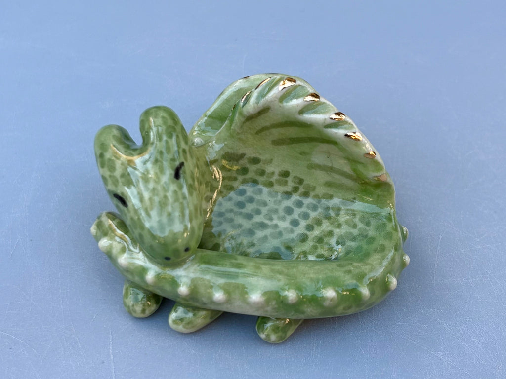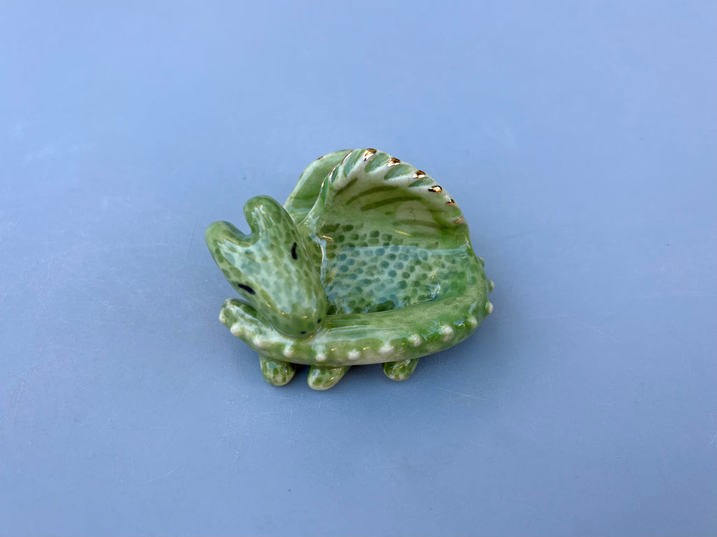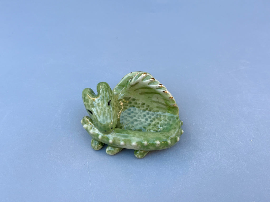 Tiny green dragon figurine, hand sculpted and hand painted. Dragons symbolize protection, wisdom, and strength. Green dragons in particular are powerful guardians of nature, reminding us of our connection to the natural world around us and our harmony within that. Keep it nearby on your nightstand, where you work, nestled in a small plant, or any special spot where you can see it throughout the day. This little dragon sculpture is ceramic, hand painted, and kiln fired to a glossy finish. The dragon sparkles with touches of real 22 karat gold.